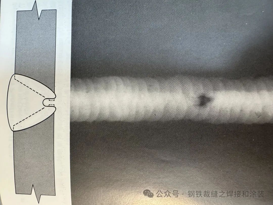 焊接根部有过量焊缝金属。影像中央,有较光亮部分沿焊道方向伸展,或是个别圆点。