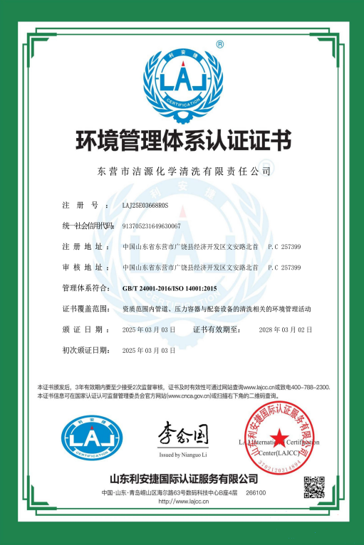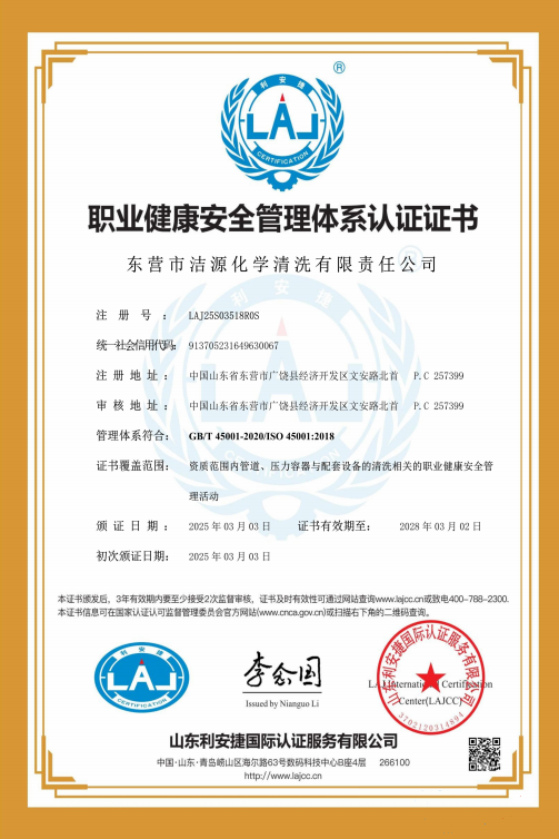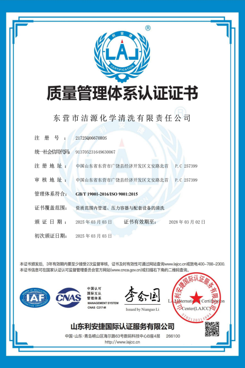 东营市洁源化学清洗有限责任公司始建于 1986 年,从事专业清洗39年,涉及管道及设备的各种化学清洗;超高压水射流清洗;新造舰船主机、液压、滑油系统化学清洗及串油技术;各种管道PIG 清洗技术等,对大型军事舰船、潜艇等军事装备清洗具有高端的研究与成果,并具有丰富的实战经验。